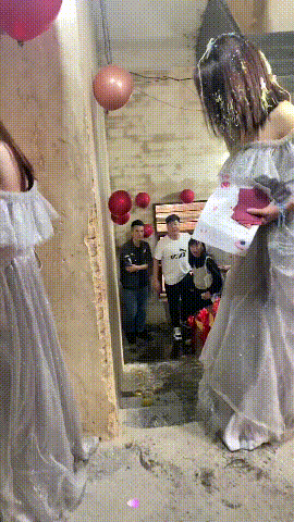 新娘家是还未装修的自建楼房,新娘住在二楼,因此新郎一行人需要从一楼穿过楼梯来到二楼。