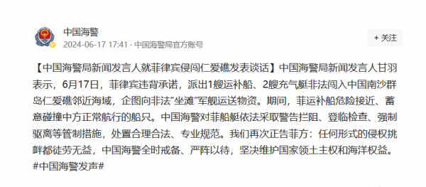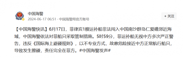 而在6月17日,菲律宾出动了多艘船只试图强闯我国南海仁爱礁!6月17日中国海警发布权威公告:菲律宾违背承诺,派出1艘运补船、2艘充气艇非法闯入中国南沙群岛仁爱礁邻近海域,企图向非法"坐滩"军舰运送物资。期间,菲运补船危险接近、蓄意碰撞中方正常航行的船只。中国海警对菲船艇依法采取警告拦阻、登临检查、强制驱离等管制措施,处置合理合法、专业规范。我们再次正告菲方:任何形式的侵权挑衅都徒劳无益,中国海警全时戒备、严阵以待,坚决维护国家领土主权和海洋权益。