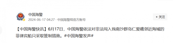 中国海警发布的权威公告,将整个事件都说地非常清楚。首先关于这次事件中国海警最早是在6月17日凌晨04:27分就发布了第一条公告,说明菲律宾这三艘舰艇在04:27之前就试图强闯仁爱礁,06月17日下午17点41分发布的公告则是对整个事件进行了详细的说明。通过中国海警发布的公告我们可以看到,这三艘菲律宾船只试图借着夜色掩护强闯仁爱礁时被我海警及时拦阻,过程中菲律宾船只竟然蓄意碰撞了中国海警船,这明显是被中国海警拦截驱离后菲方船只恼羞成怒了!