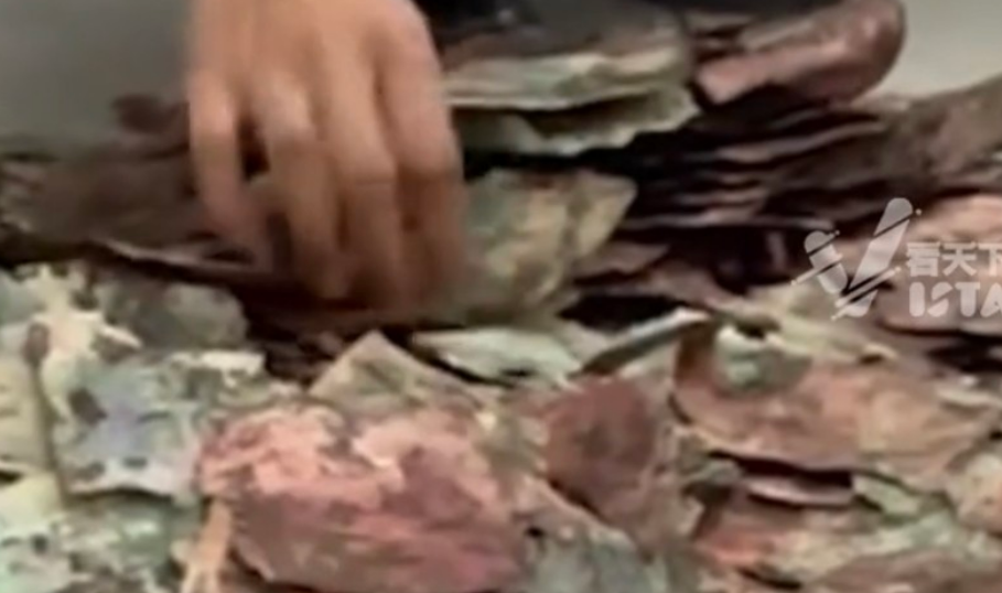 通过家人拍摄的视频可以看到,大量的纸币已被白蚁侵袭,留下了无数的痕迹,几乎每一张纸币都不同程度地发霉,有的已经破碎,几乎无法辨认其原有的面貌。