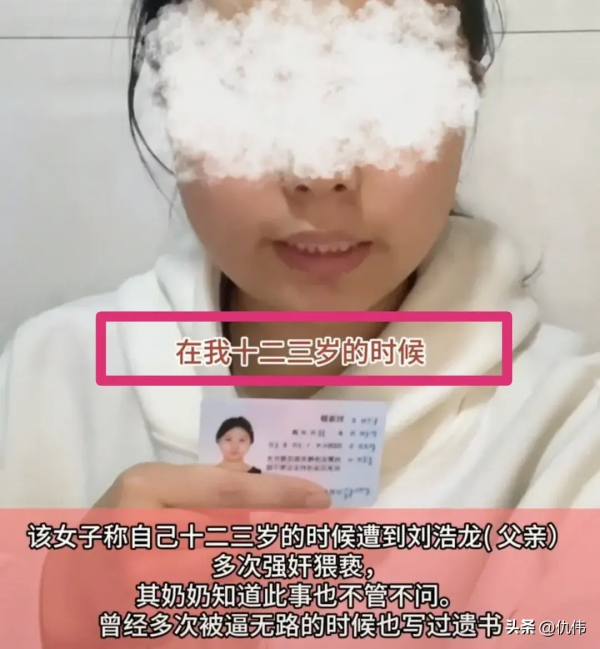 她说自己的父亲叫刘浩龙,在自己十二三岁的时候,父亲把自己性侵了,而且不止一次,除此之外,只要有机会父亲就猥亵自己。