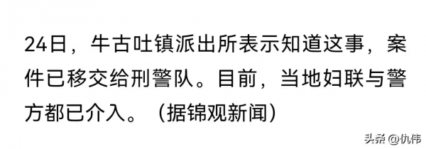 此事越闹越大,已经惊动了当地警方和妇联,据"锦观新闻"最新消息:当地派出所回应已经知道此事,案件移交给了刑警队,当地警方和妇联都已经介入,案件正在进一步调查中!