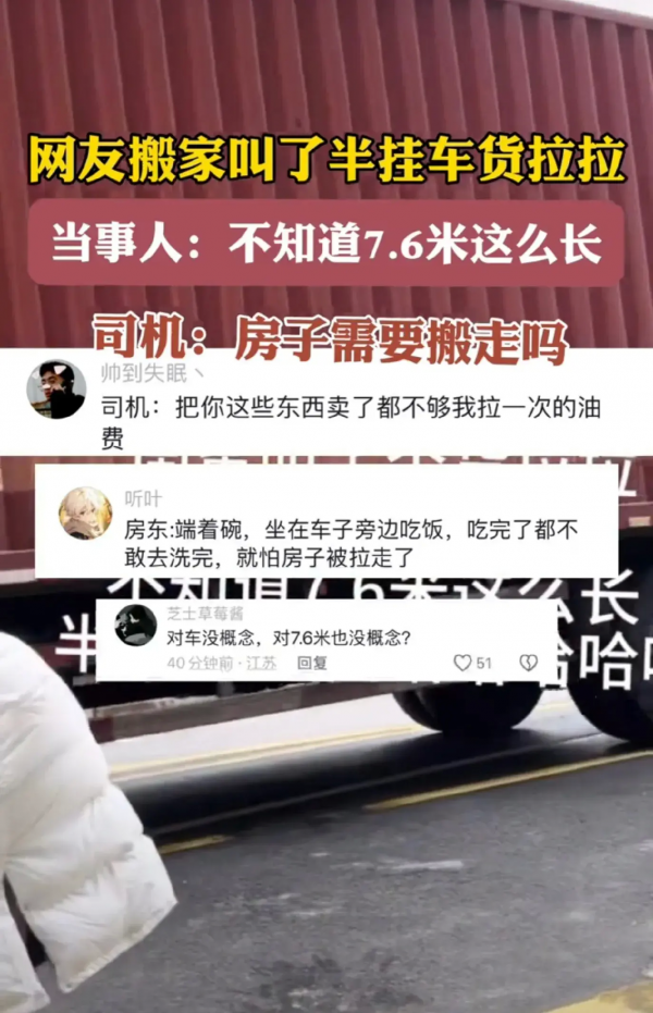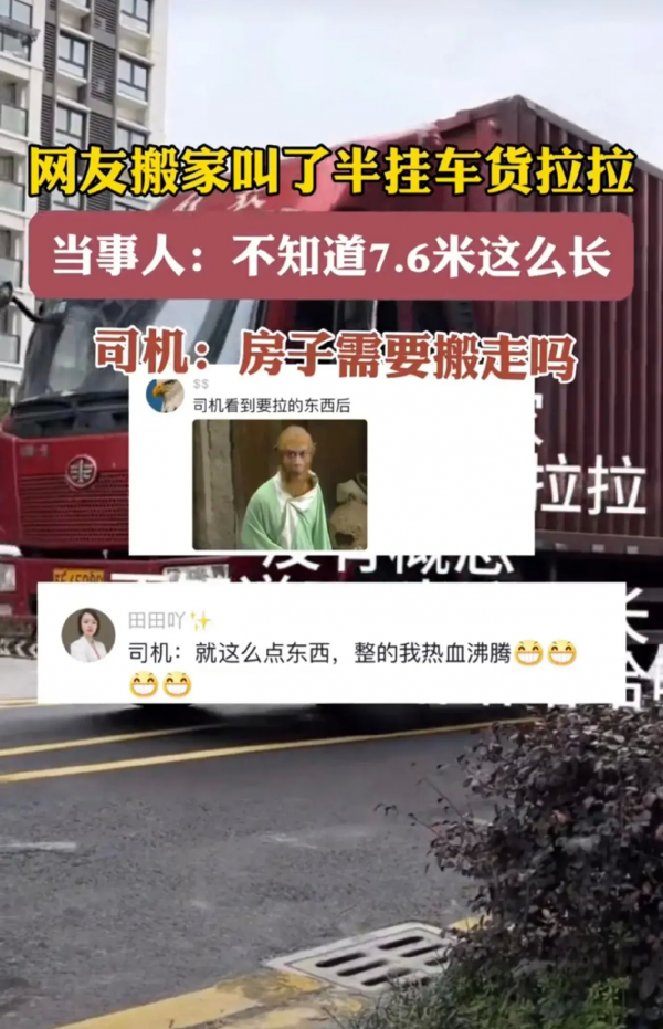 女子尴尬地表示:"我对货车尺寸没有概念,以为300元可以叫一辆小货车,没想到会是这么大一辆,我当时都惊呆了!"网友则忍不住调侃道:"这不是大炮打苍蝇,大材小用了吗!"总之,场面一度十分尴尬但又令人捧腹不已。