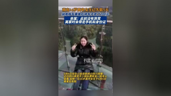 寻人启事显示,四川南充市白塔中学高一学生谭某某,于5月5日上午8时7分离家,至今未归。家长已向高坪区公安局报警。民警调取监控发现,该失踪学生骑电动自行车失踪于高坪区八角街。寻人启事公布的监控视频截图显示,谭某某离家时背着书包、穿着校服,骑了一辆小型电瓶车。