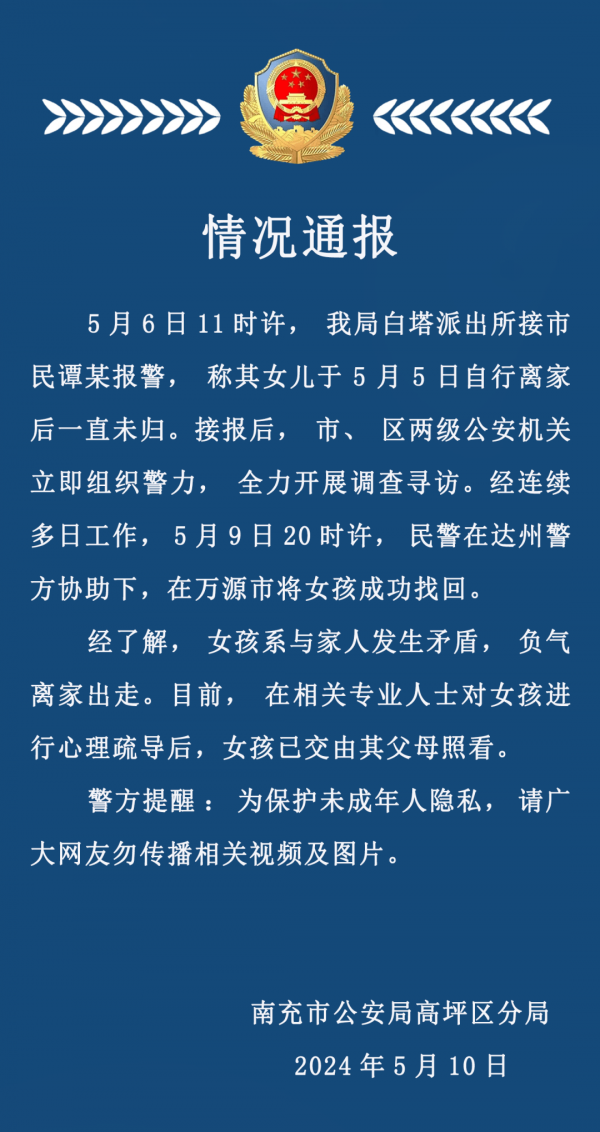 通报称,5月6日11时许,白塔派出所接市民谭某报警,称其女儿于5月5日自行离家后一直未归。接报后,市、区两级公安机关立即组织警力,全力开展调查寻访。经连续多日工作,5月9日20时许,民警在达州警方协助下,在万源市将女孩成功找回。