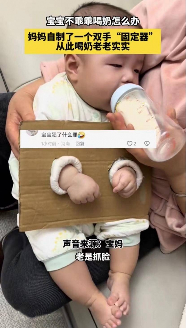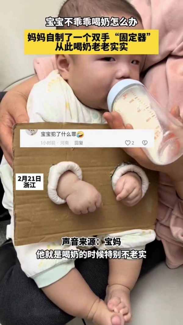 这是在干嘛?众多网友看了后哭笑不得,百思不得其解,难道宝宝喝奶也犯了什么罪,至于给套上"枷锁"吗?