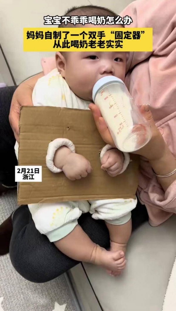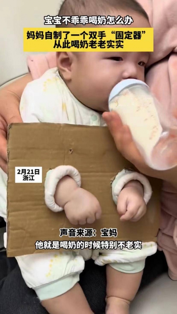 下面这位可爱的宝宝,喝奶的时候很不老实,聪明的宝妈灵机一动,亲自制作了一副纸壳"枷锁"给他的双手套了上去,再喝奶的时候,宝宝果然老实了许多,不过,从远处看的话,还以为宝宝犯了什么罪,以至于被戴上了"枷锁"。