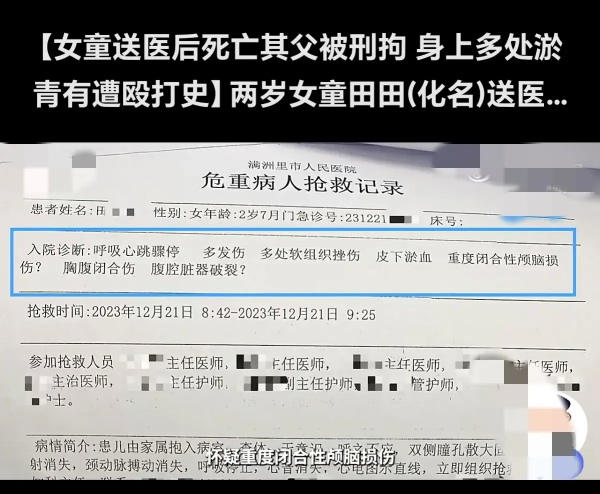 根据报道,这起发生在满洲里的家庭暴力导致了一名两岁七个月大的女童丧命。女童被送往医院抢救,但最终被宣布死亡。父亲田某龙承认自己曾经殴打过女儿,而这个事实使得整个事件更加令人愤慨。