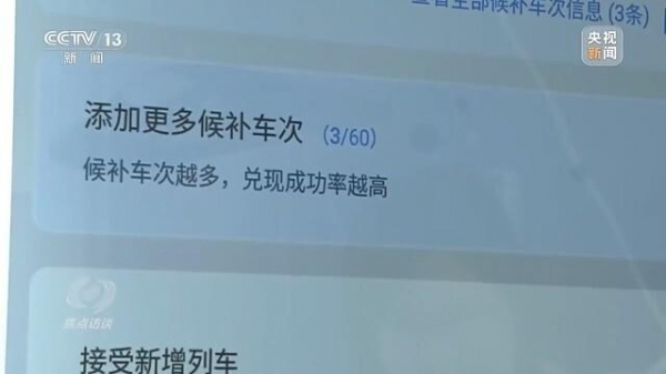 热门时间、热门地点的车票肯定是一票难求。比如说在春运进入第四天时,北京到哈尔滨大年三十当日的全部车票已经售罄,但是如果选择加入候补名单也有一定的机会。12306有关负责人提醒乘客,在添加候补车次时,建议勾选上"接受新增列车"这一选项,这就像高考填志愿接受调剂一样,可以大大提高候补成功率。