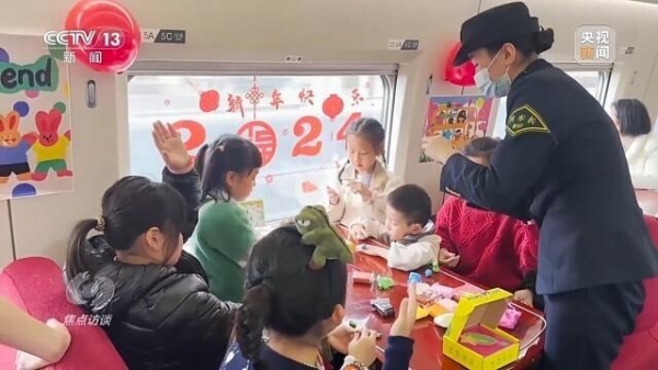 不仅要让旅客顺利回家,还要让回家路更舒适。在厦门开往上海的G1654次高铁列车上,一群小旅客在乘务员的带领下玩着小游戏。今年春运期间,这趟列车的餐车部分区域被临时改造成了"遛娃舱",这方便的可不仅是孩子和家长。