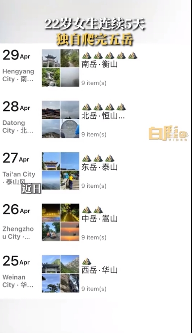 近日,一22岁女生从华山开始到衡山,5天爬完了五岳。她称看到别人5天爬完了五岳,想挑战一下当做自己的生日礼物。