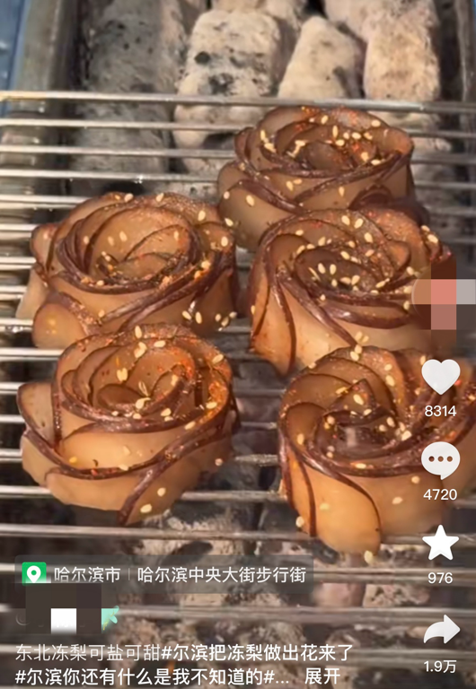 哈尔滨旅游火爆全网,作为东北特产的冻梨也备受欢迎。继冻梨切片、冻梨花茶后,哈尔滨一餐厅将冻梨雕花并撒上辣椒粉做成烧烤,称适合吃辣的南方朋友。