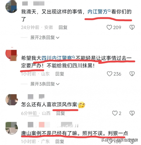 现在广大网友要求严惩,把压力给他警方,看他们如何处置此事,前有唐山案例,希望警方能够为老百姓主持公道,让作恶者得到应有的惩罚,不能让这群害群之马给我们四川抹黑。