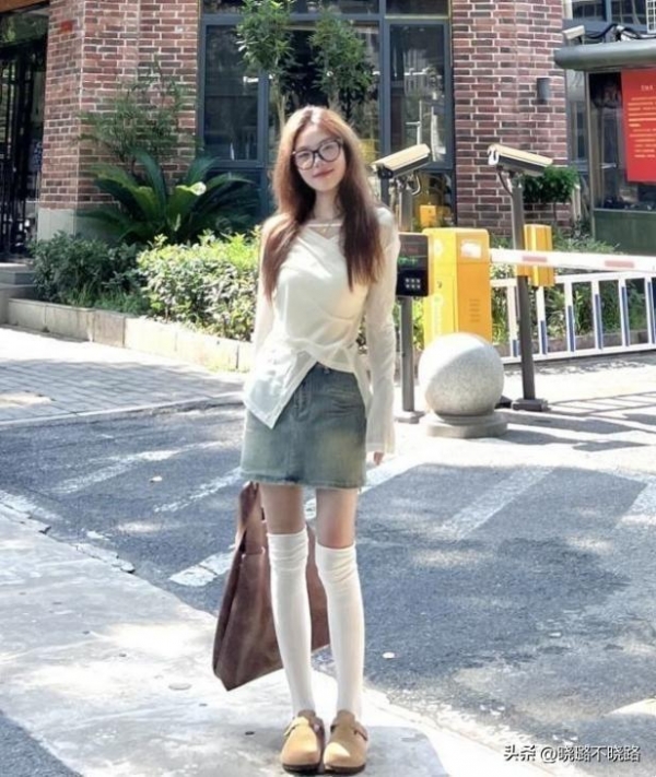 建议1:不规则款上衣+牛仔短裙,结合长筒袜