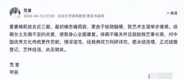 近日,著名的书法大师范曾。在自己的社交平台上发文宣布自己再婚的消息,而且还特意晒出了自己和新婚娇妻的合影照。