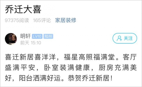 前两天,萧山一小伙在萧内网App发帖分享乔迁新居,引网友围观点赞。