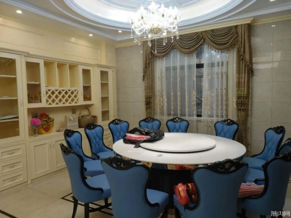 小伙介绍说,外墙用的是石材干挂,内部装修是亲戚的装修公司做的,家里的柜子是找木工专门打的。目前客厅的蓝色餐椅看着不协调,是因为厂家发错了,后续会换成米黄色。