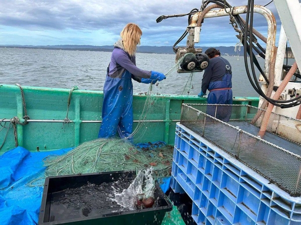 船慢慢靠近港口,岸上已经有人提着桶在等,广三把鱼虾按类别各捞出一只放进写着"检测室"的桶里。他说,渔协的人会带走送去检测,每一次出海捕鱼都要抽样送检。他和儿子边清理渔网边和街坊闲谈,聊起海水水温上升。当突然被问及核污水排海的影响,他迟疑了一会。