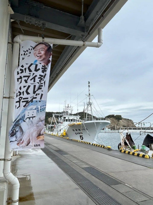 福岛县久之浜渔港挂着宣传横幅"福岛,美味!福岛,骄傲!鱼!"