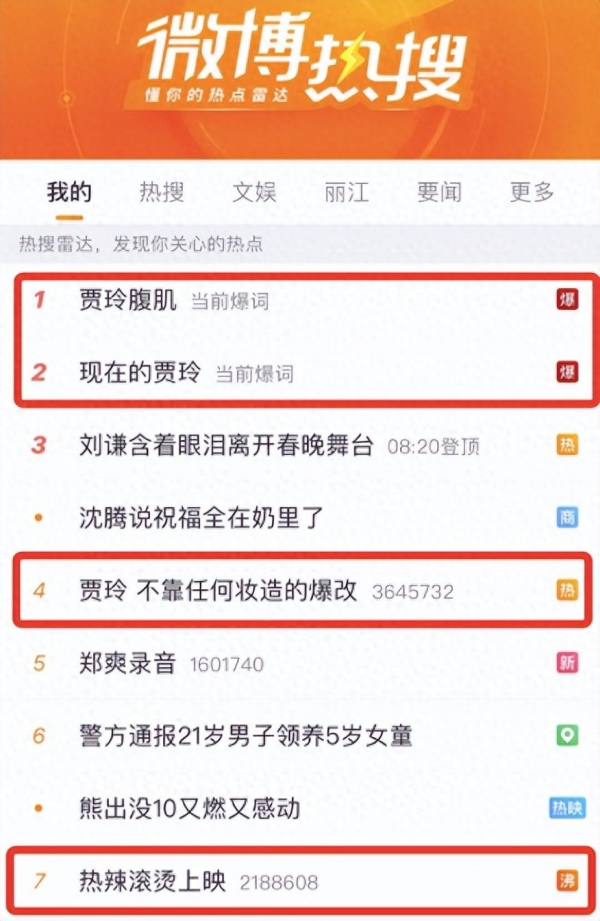 打开微博就是#贾玲腹肌#,#现在的贾玲#,#贾玲 不靠任何妆造的爆改#,以及#热辣滚烫上映#等话题霸榜,直接就是爆爆爆!