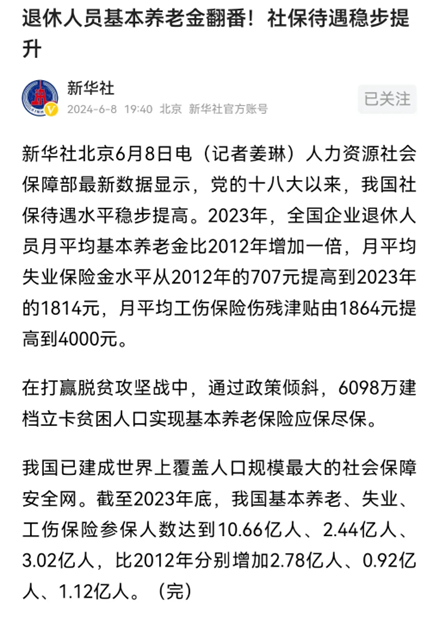 根据新华社消息,人力资源社会保障部的数据显示,2023年全国企业退休人员月平均基本养老金比2012年增加了一倍。2012年全国企业退休人员的平均养老金是1686元,也就是说,2023年全国企业退休人员平均养老金是3372元。