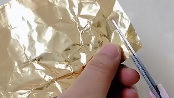 我们可以用剪刀将锡箔纸剪成一厘米宽的小长条,剪出几段。