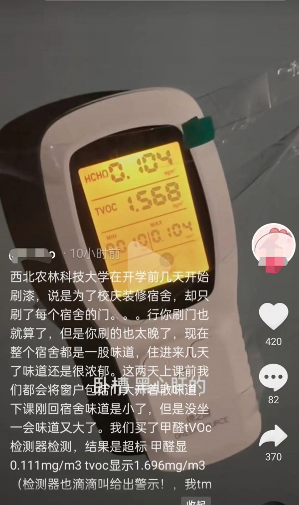 近日,陕西咸阳,有西北农林科技大学的学生在网络吐槽,学校在快开学的时候将宿舍门刷劣质油漆,学生返校后发现气味刺鼻,在宿舍呆几分钟就头晕,为除甲醛和异味,尝试过各种方法皆无效,有的同学只能去校外住酒店。