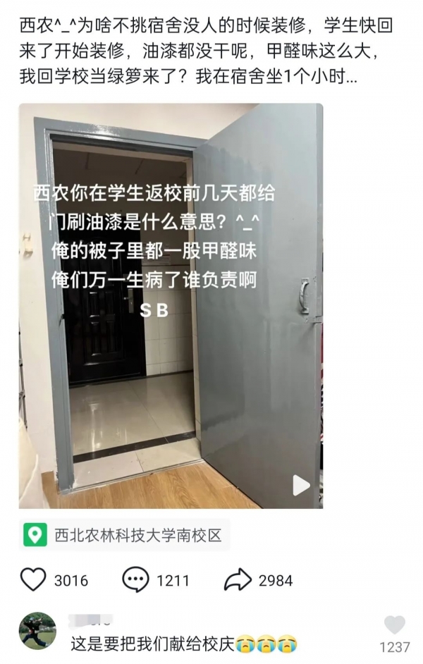 2月19日,有该校同学在社交媒体上称"西农为啥不挑宿舍没人的时候装修,学生快回来了开始装修,油漆都没干呢,甲醛味这么大,我回学校当绿萝来了?我在宿舍坐1小时感觉都要吐了……"2月29日,有同学在社交平台上发视频称:"我和油漆即将融为一体,吸着吸着就感觉不到味儿了。"