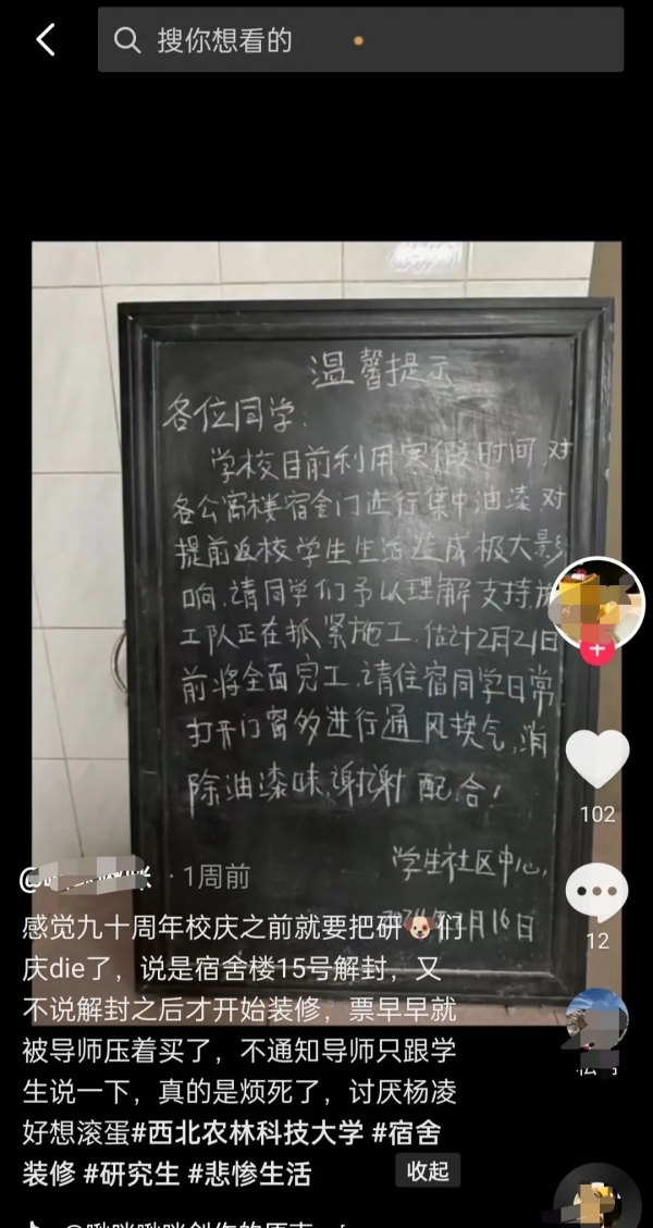 大皖新闻记者搜索注意到,2月12日,有该校同学在短视频平台上发视频表示"西农南校寒假在给宿舍的门刷油漆,我在楼栋外都闻到了。回家的小伙伴,能晚来就晚来几天吧,不行的话,先问问宿管阿姨,自己那一栋宿舍刷门了吗?太难闻了!"