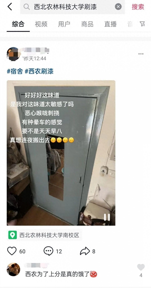 2月28 日上午,大皖新闻记者在社交视频平台上搜索"西北农林科技大学刷漆",能搜出十多个视频。"是我对这味道太敏感了吗……有种晕车的感觉……真想连夜搬出去"一位坐标位置显示为西北农林科技大学南校区的网民说;"开学前刷漆,这合理吗?"另外一位坐标位置显示为"西农大北校区"的网民说。