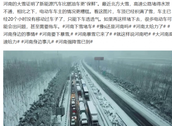然而,新能源车主在这场春运中面临了更大的挑战。极寒天气下,电动车的续航表现堪忧。在湖北、河南大雪期间,高速公路的堵车问题成为了新能源车主的噩梦。堵车五小时,续航只走了20公里,这是何等的煎熬?电动车在寒冷天气下的表现愈发显得力不从心。