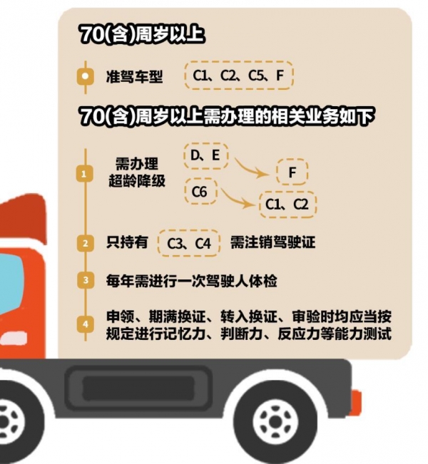 所以根据相关规定,70岁以上的老年人禁止驾驶大、中型载客汽车汽车,也就是说他们不能拥有A1、A2或B1等级的驾驶证。