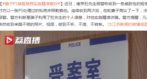 近日,南京杜先生报警称收到一条威胁性的短信,对方以一张PS处理过的私密床照勒索他。连续收到两次后,他和妻子商议了一下,决定报警。警方判断是骗子利用了杜先生的个人信息,对他实施精准诈骗。警方提醒,凡是突然收到来路不明的照片、视频,做到不听、不信、不转账。