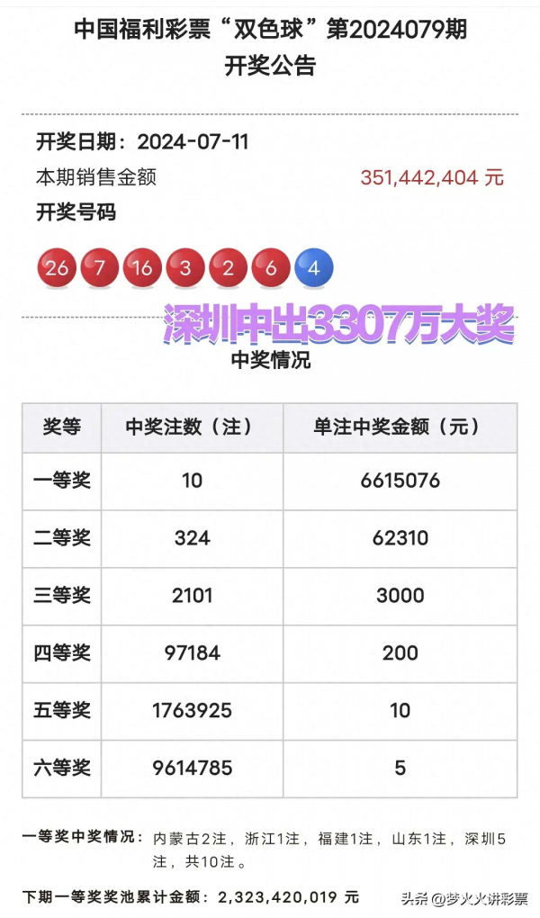 7月9日晚,双色球第24079期的开奖号码为:02 03 06 07 16 26+04。