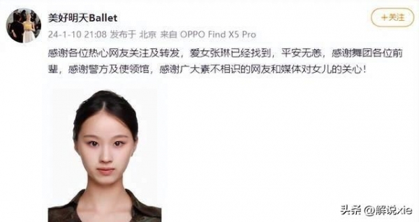 1月9日深夜,舞团首席舞者在社交平台发布张琳的寻人启事。