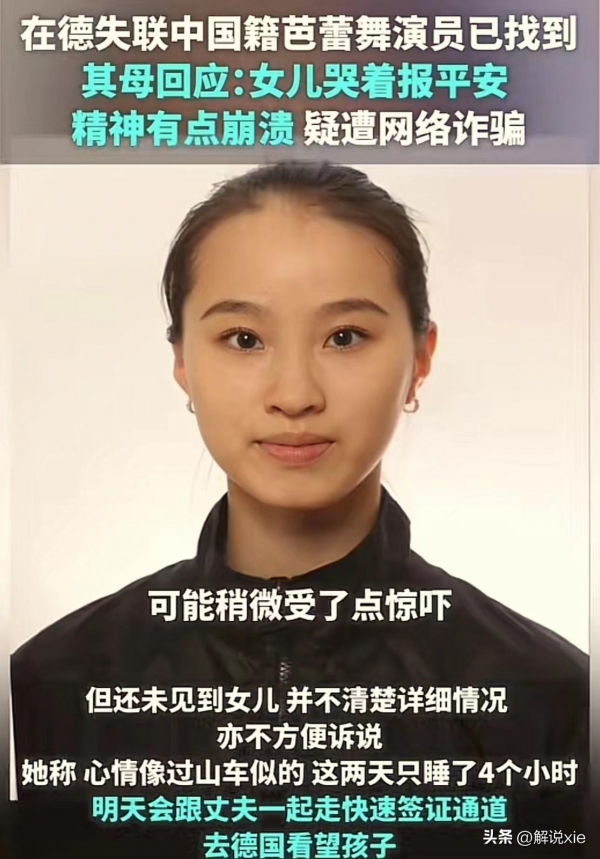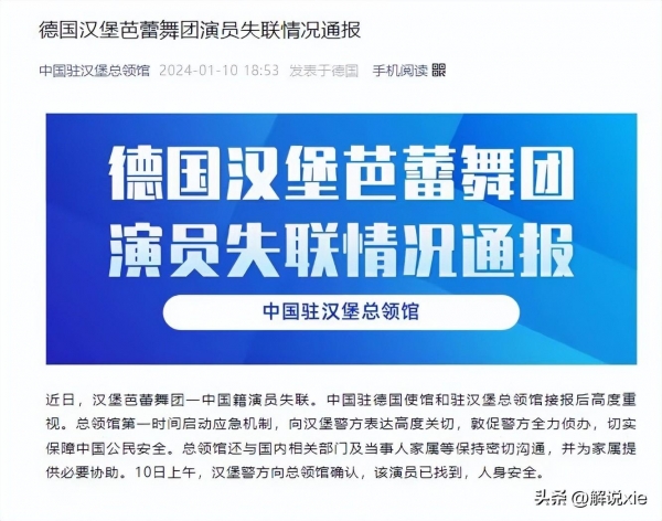 "近日,汉堡芭蕾舞团一中国籍演员失联。中国驻德国使馆和驻汉堡总领馆接报后高度重视。