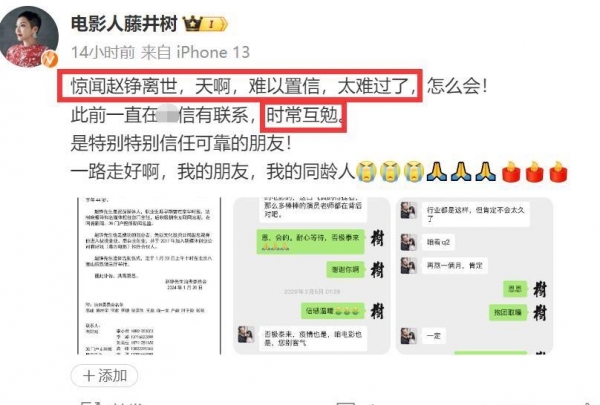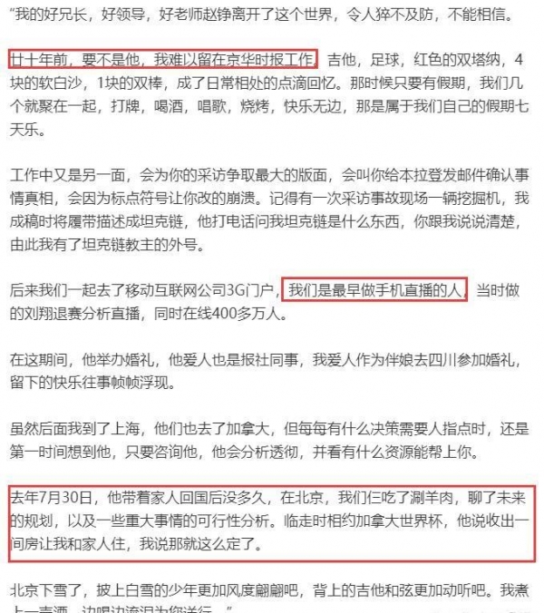 赵峥京华时报的好友发长文缅怀,称20年前要不是有他,他根本就留不住到北京工作,他们是一批最早做手机直播的人,如今却走在北京的下雪天