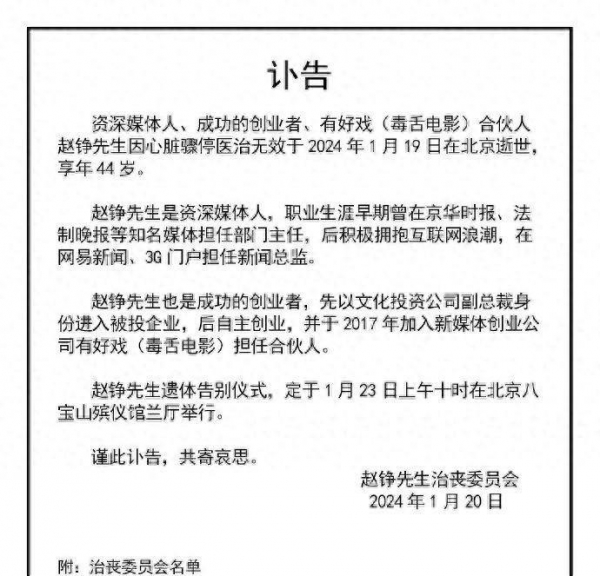 1月20日,电影解说头部账号"毒舌电影"的合伙人、资深媒体人赵铮去世,享年44岁。