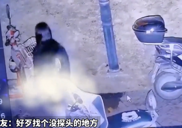 期间,女子一边跑一边脱裤子。随后,她在两辆电动车中间蹲下身,正对着监控,开始解决个人问题。