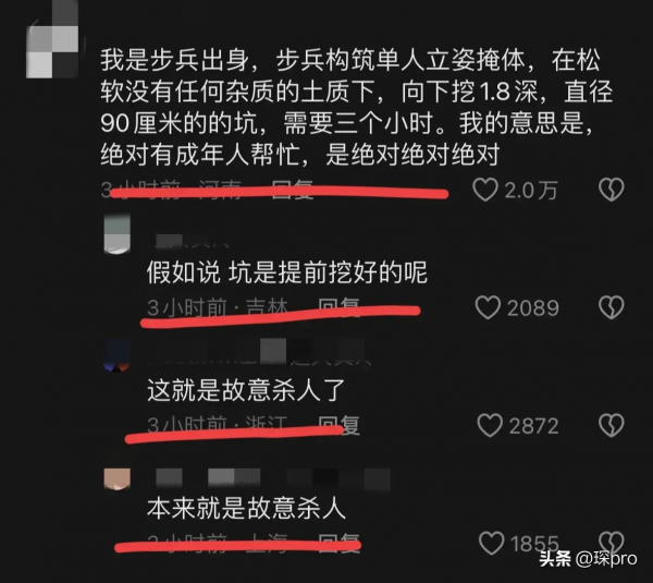 更有一名兵哥直言,在松软、无杂质的土壤中挖掘一个深 1.8 米、直径 90 厘米的坑,至少需要三个小时,他坚信有成年人参与其中。