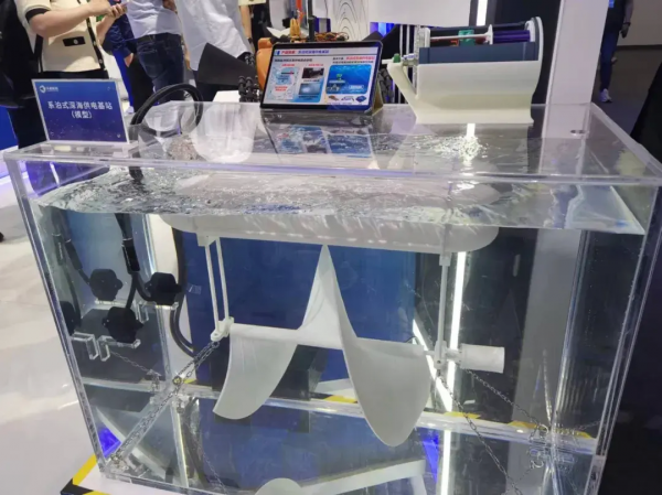 老司机注意到,博雅工道公司并非唯一在现场展出仿生无人潜航器的公司。西安天和防务公司在展会上也发布了多型水下潜航器,包括类似鱼雷的5公斤级、10公斤级传统水下无人自主潜航器,以及外形类似鲨鱼的人工肌肉机器鱼。此外,目前这些无人潜航器大都依靠电力驱动,电池电量在很大程度上限制了它们的活动时间和范围。而天和防务公司推出的系泊式深海供电基站提供了一种解决方案。工作人员介绍说,它的原理是利用水下海流发电原理,当海流通过系泊在海底的发电站时,会带动水轮机发电并将电能储备起来。经过精心设计,这种深海供电基站能抵抗高速海流冲击,同时低速海流经过时也可以发电,具备很强的适应能力。这种深海供电设备可以满足各种海洋传感器的供能要求,完成在某一海域的长期海洋观测任务。