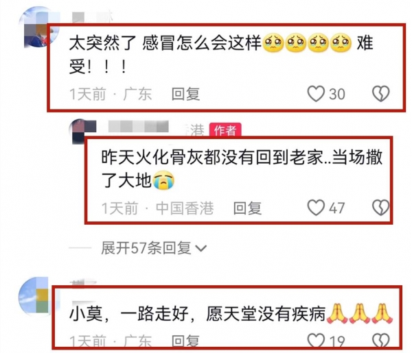 网友们也纷纷在评论区留言悼念送别小莫:"小莫愿你来世再无这么痛苦""小莫一路走好,愿天堂没有病痛"。
