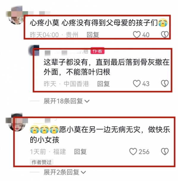 更让人难过的是,小莫并没有落叶归根,据她的好友透露,小莫离世被火化后,她的父亲没有认领她的骨灰,也没有计划把骨灰带回老家安葬,小莫的骨灰只能当场撒在了外面,好友悲痛的表示,小莫这辈子都没有得到父母的疼爱。