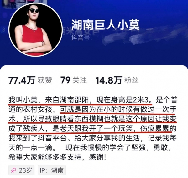 据小莫在简介中透露,她虽然拥有2.3米的身高,但是她却是个残疾人,小时候因为做手术,她的眼睛视力下降,导致看东西模糊,她开通短视频账号分享自己的生活,现在的她慢慢学会了坚强勇敢,小莫在平台也拥有了14.8万粉丝,经常会开直播和网友们聊天。