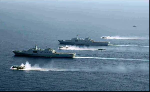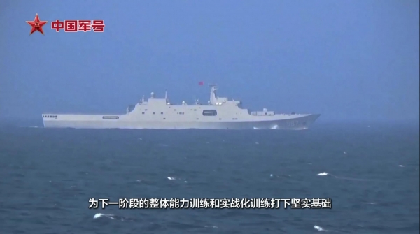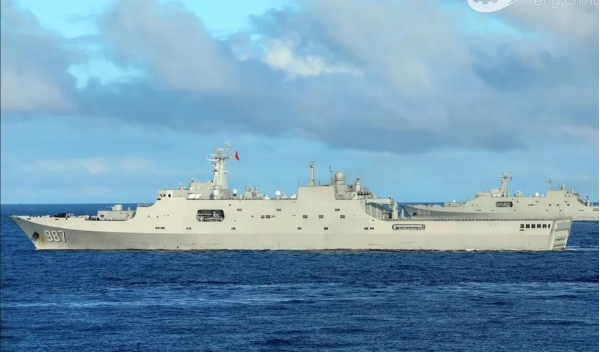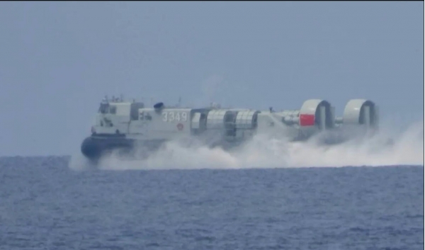 据解放军官方"军号网"发布的消息,中国海军排水量25000吨的大型船坞登陆舰987"五指山"舰前往南海某海域进行了一次多科目、高强度的实战化训练。这次演练的地点在南沙东部的仙宾礁。菲律宾方面已经拍摄到,987"五指山"舰在仙宾礁释放"野马"LCAC气垫登陆艇进行抢滩登陆的演练。