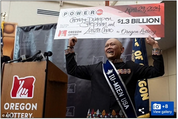 据报道,陈塞凡是从老挝移民美国的,已与癌症抗争 了 8 年,他与 37 岁的妻子 段女士(Duanpen )以及 55 岁的朋友赵莱扎( Laiza Chao ,音译)将分享这 13 亿美元的奖金。税后三人将获得4.22 亿美元。