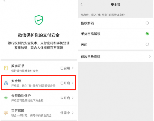 开通方法为:打开【我的】-【服务】-点击【钱包】-【消费者保护】-【安全保障】-【安全锁】,对应选择指纹或手势密码解锁即可。