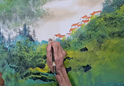 在罗科通的指点下,奶奶成功地勾勒出大片的黑疙瘩。"这是啥?"奶奶灵魂发问。"别急。"待墨迹干透,罗科通递上一小瓶提前调好的蓝色颜料,"奶奶,把这个倒上去玩儿一下。"奶奶有点儿紧张,看着他:"倒在哪里?""随便倒哦。"天青、石绿,依次倒在黑疙瘩上,继续点点抹抹,不一会儿,成了郁郁葱葱的树木。最后在画纸顶端刷上薄薄一层橙红色,一幅色彩绚丽的山间日出图大功告成!