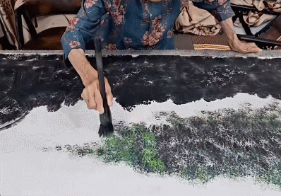 用大水舀倒上各色颜料,吹风机吹出纹路,粗笔刷,细笔点;