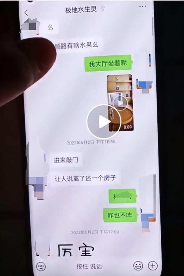 据韩某提供的微信聊天记录显示,刘某多次与一微信名为"极地水生灵"的用户联系,聊天记录中有"进来敲门,让人说离了还一个房子""房子订了,报我名字,不能取消"等对话。